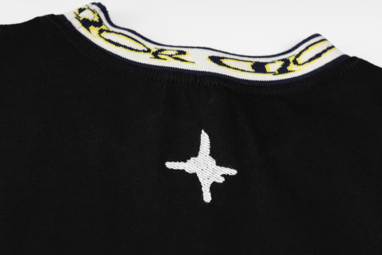Chữ nghệ thuật độc quyền được vẽ lên, và họa tiết cổ áo được dệt bằng các sợi màu đặc biệt. Đây là máy dệt kim jacquard hoàn toàn tự động. Máy dệt jacquard vi tính hóa lưu trữ trước dữ liệu mẫu trên đĩa máy tính, sau đó đưa đĩa vào máy tính của máy dệt kim, máy tính này sẽ điều khiển quá trình dệt. Cổ áo dệt phẳng jacquard tinh tế có kết cấu rõ ràng, độc đáo, chi tiết phong phú và nhiều lớp màu, đồng thời có khả năng chống biến dạng. Kỹ thuật dệt hai lớp đặc biệt tạo ra các lớp màu phong phú, hiệu ứng jacquard ba chiều mạnh mẽ, đồng thời thoải mái, thân thiện với da và thoáng khí.