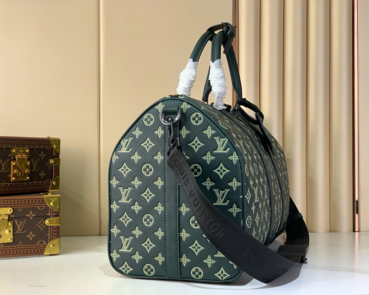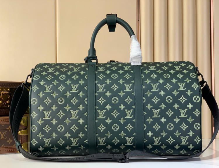 Chiếc túi du lịch Keepall Bandouliere 50 này được làm từ da bê Monogram Shadow mềm mại với họa tiết Monogram dập nổi.