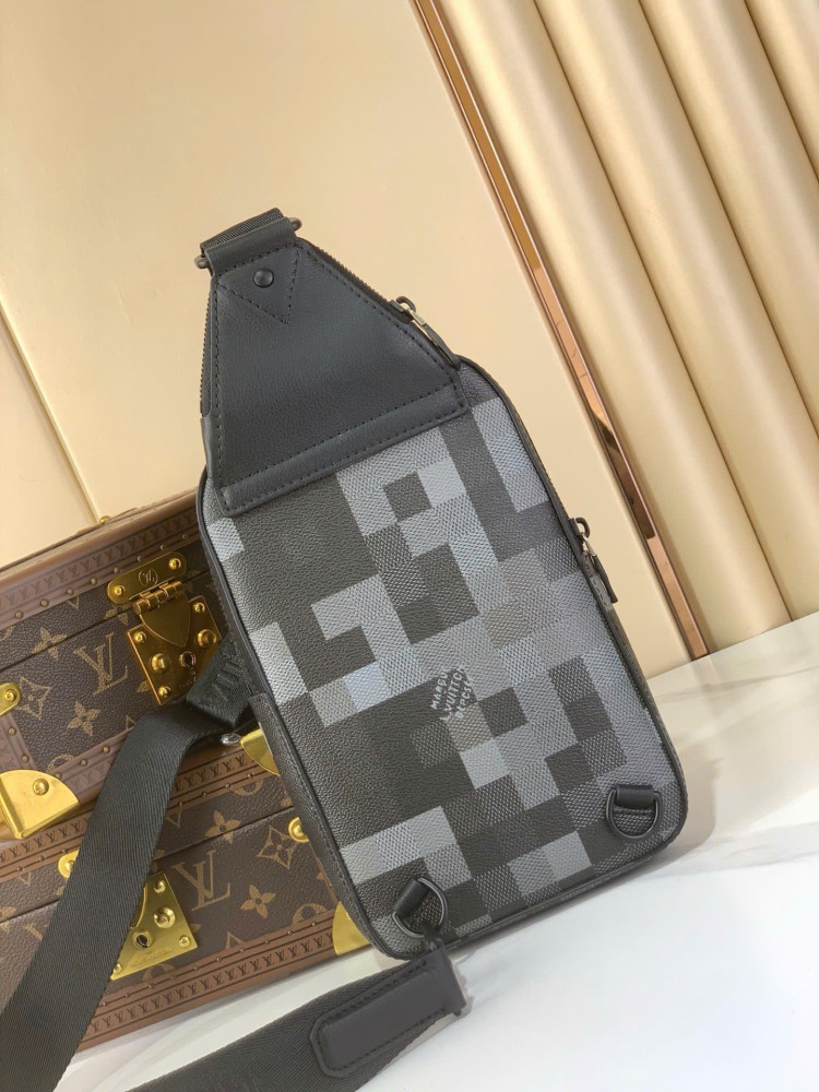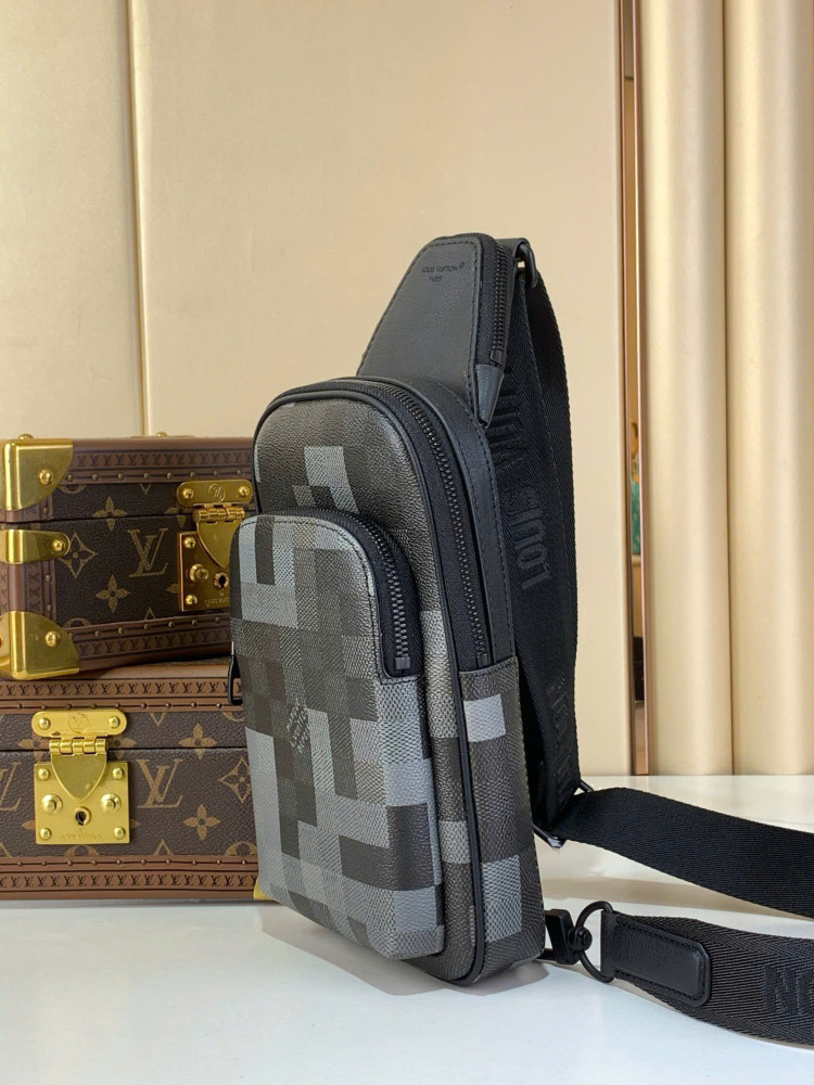 Chất liệu vải Damoflage màu đen tái hiện thiết kế hiện đại của túi đeo chéo Sling Avenue. Các tông màu xám và đen dạng pixel kết hợp với phần cứng màu đen mờ tạo nên vẻ thanh lịch nam tính. Túi đeo chéo Sling Avenue có một ngăn chính và hai ngăn có khóa kéo để tăng thêm tính tiện dụng. Quai xách có thể điều chỉnh thoải mái để sử dụng bên hông.