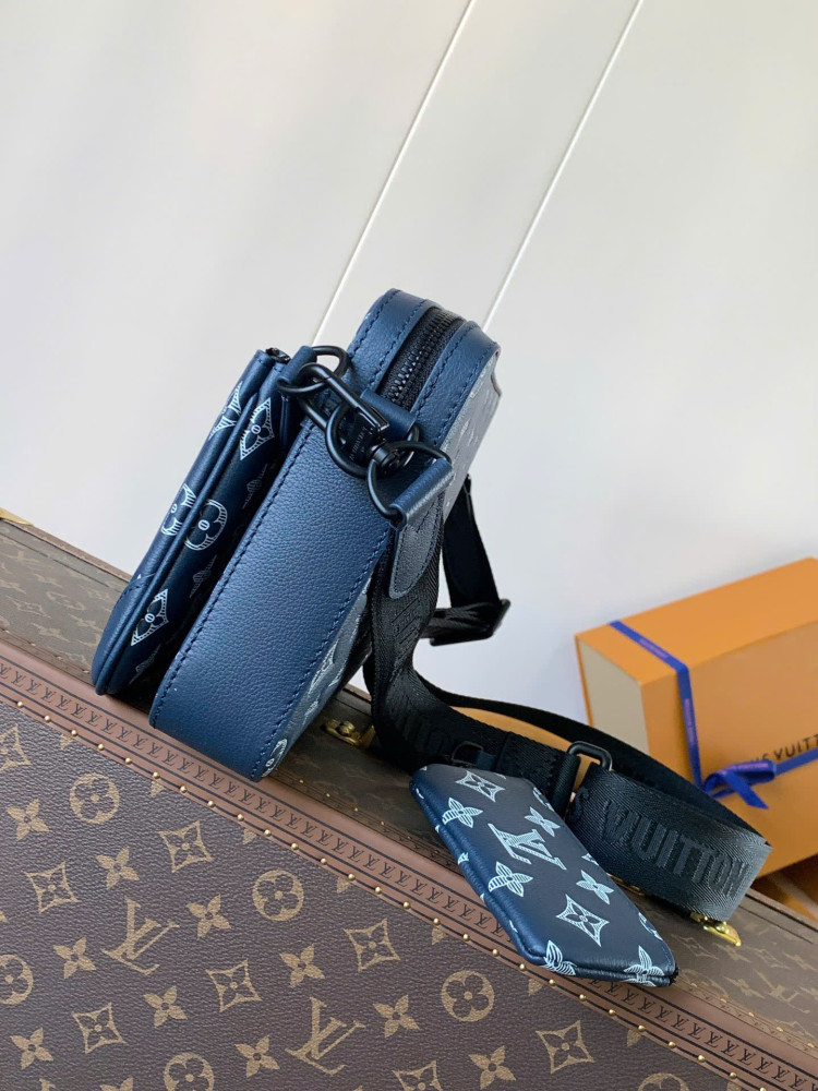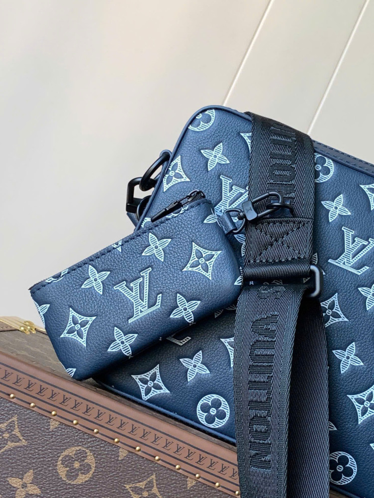 M24753 Màu xanh dương. Túi đeo chéo Trio này được làm từ da bò dập nổi họa tiết Monogram. Ngăn trước có khóa kéo và ví nhỏ đựng tiền xu trên dây đeo vai có thể tháo rời, tăng thêm tính tiện dụng cùng với ngăn chính. Dây đeo vai bằng vải jacquard có thể tháo rời và điều chỉnh được, in logo thương hiệu, cho phép đeo vai hoặc đeo chéo thoải mái. Kích thước: 25×18.5×7cm